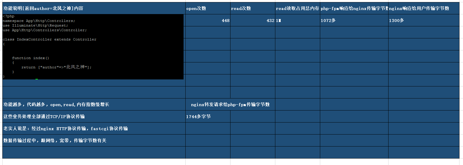 大家可以看到,一个小小的业务需求,它就加载一大堆的【open,read,lstat,close文件,这些操作都是要去磁盘里读取,框架越重,php-fpm处理时间越长,当然了php-fpm本身是个守护进程,接收一次tcp连接和数据传输后,它就断开了】在这里大家可以自行的进行测试,从框架的index.php到最后输出,打开了N个文件,都是要操作磁盘,读取的数据当然是要占用内存,c会申请一堆内存再去处理这些脚本的语法,进行解析。